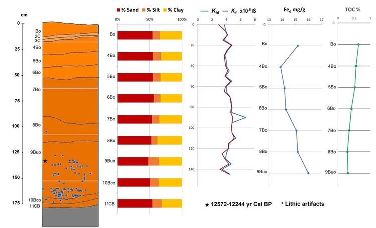 The topsoil Bo horizon presents clay and iron oxides accumulation. Below it there are two light coloured layers of redeposited sorted quartz sand: 2C which is also different in color and 3C with a light inclination (15°) from NW to SE and they cover the sequence of several Bo horizons with more similar characteristics (they are clayey materials, compact, with good structure, enriched in iron, but they also contain a high proportion of coarse fraction, anortic iron nodules and lithic fragments with preferential orientation, for which they were identified as eroded soils and classified as Bo horizons). The 4Bo horizon is more indurated in comparison to the underlying 5Bo and 6Bo and the 5Bo has a higher content of sand. The horizons 7Bo, 8Bo and 9Buo are richer in clay and moisture content by contrast to upper-lying 5Bo and 6Bo horizons, but their density is lower. Common separated iron nodules start to appear in the 9Buo horizon and form the so called “stone line” in 10Bco. At the same time, the concentration of lithic artefact starts to increase in the 9Buo horizon and reaches its maximum at the 10Bco horizon where they rest on the top of the stone line. At the bottom of the excavation there is a white, strongly weathered saprolite from gneiss (11CB horizon).