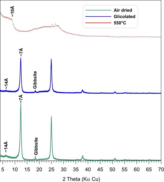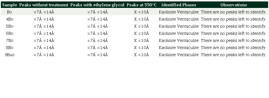 5. Clays from all horizons was identified and total mineralogical composition of two samples was studied by XRD. For whole rock analysis, samples were ground in an agate mortar, sieved to less than 45 microns and loaded on aluminum sample holders. For the identification of clays, the cementing agents were removed to disperse the particles and the clay fraction was extracted according to Stoke’s law (Jackson, 1958; Moore and Reynolds, 1997). The prepared samples were mounted on glass slides, dried at 30 °C (Moore and Reynolds, 1997) and solvated with ethylene glycol at 70 °C for 24 hours. Bulk rock phase identification and quantification by Rietveld method (Rietveld 1969) was made using Highscore v4.5 software (Malvern, UK), using International Center of Diffraction Database (ICDD) and Inorganic Crystal Structure database (ICSD). Kaolinite has been identified by (001) peak at 12.5° 2θ (~7Å) in the air-dried and glycolated samples. By heating to 550ºC kaolinite becomes amorphous and its diffraction pattern disappears. The presence of few vermiculites in the samples was confirmed by (001) reflection at about 6°2θ (~14Å) in the air-dried condition that was not affected by ethylene glycol treatment and collapsed to 10 after heating at 550°C.