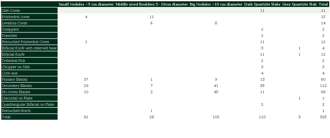 Among the materials recovered during the surface survey, were found levallois cores, polyhedral cores, and tabular cores, levallois flakes, centripetal extraction flakes and irregular flakes, as well as different “core tools”, MSA points, bifacial knives, tranchets and discoid, made from quartzite and quartz. The raw materials of the artifacts were extracted from quartzite slabs, as well as small boulders. All surface tools correspond to the MSA (according with definition for Equatorial Guinea from Mercader and Martí 1999, 2002). No pottery, blades or microliths were recorded at the site. Results are summarized on table 1.