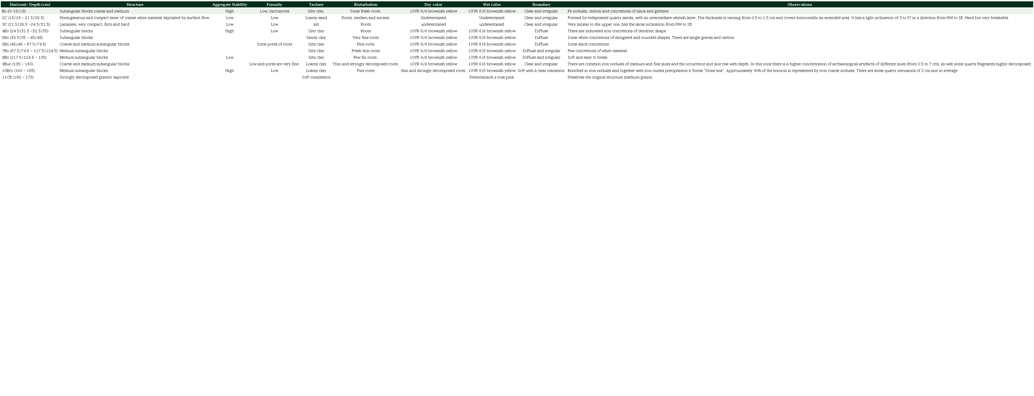While the archaeological excavation was carried out, the west and south profiles of the excavated pit were described with a pedological approach, for paleopedological and paleoenvironmental studies.