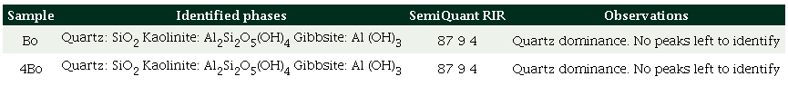 A semiquantitative analysis was performed by XRD to the total sample of Bo and 4Bo horizons (Table 3), considering that they correspond to different times of deposition and pedogenesis, separated by 2C and 3C. The results showed that both samples are mainly composed of three mineralogical components: quartz (Bo 87% and 4Bo 90%); kaolinite (Bo 9% and 4Bo 7%), and gibbsite (Bo 4% and 4Bo 3%). XRD analysis of the clay fraction allowed to identify, in addition to kaolinite, the presence of vermiculite, which in the quantification of the total sample was not perceived because it was found in very little quantity (Table 4; Figure 9).