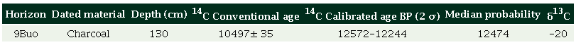 Some soil samples were processed to obtain 14C AMS dating of humic acids, however, the TOC content was extremely low, and the roots of modern trees were observed throughout the profile, even in the deep parts, which made it impossible to get reliable data. A charcoal fragment from 9Buo horizon was analyzed, resulting in an age of 12572-12244 Cal BP (Table 5).