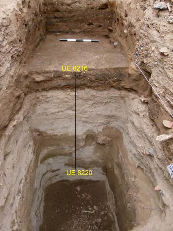 The bottom of this horizon, as in the point of contact with SU 8218 (see Figure 9), presents fine-medium quartz sand, occasional charcoal fragments and occasional discontinuous lenses of humic quartz sand. This context is probably related to wind or water deposition of sand, with occasional episodes of brief stability and organic matter accumulation, but with no buildings nor riverbed exposed.