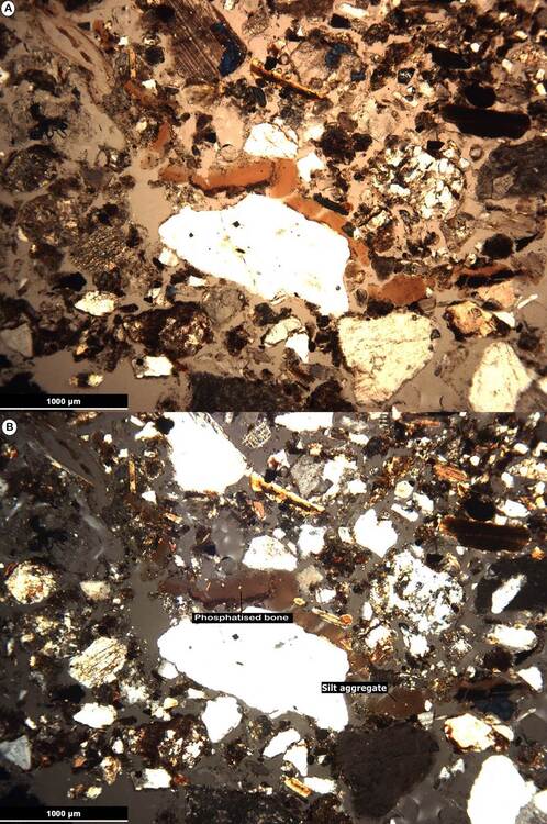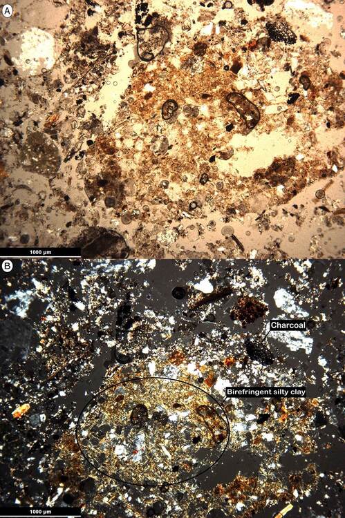 These humic and calcitic aspects with the common anthropogenic inclusions suggest that the micritic quartz sand of stratigraphic units 8217 and 8216 is probably an aggrading old land surface. This was essentially a cumulative series of thin units of brown humic sand which included pottery, bone and charcoal fragments, as well as irregular zones and rolled aggregates of birefringent silty clay (Figure 12). The latter features are indicative of some illuviation of fines (silt and clay), possibly derived from overbank alluvial inputs incorporated into this surface through soil mixing processes (Kuhn et al., 2010). It is interrupted by less organic and more sandy or silty lenses or areas with higher frequencies of anthropogenic inclusions, especially fine charcoal and micritic ash and/or degraded and phosphatised bone fragments.