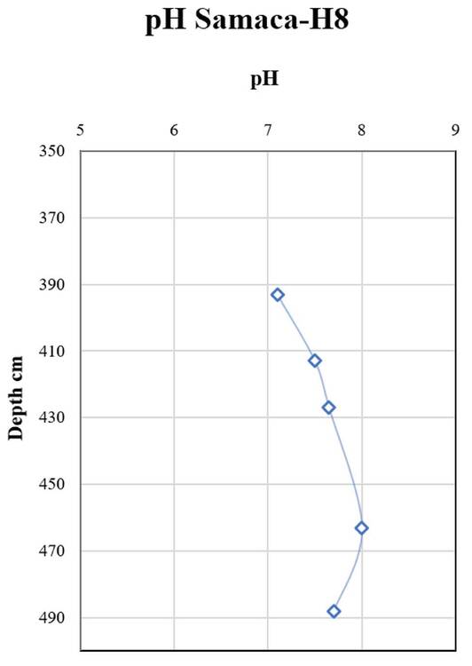 The pH values of Samaca H-8 samples range from 7.1 to 8 (Table 3 and Figure 13), which point to a neutral to moderately alkaline soil environment. The highest (alkaline) pH observed is in sample 365 (see Table 3), perhaps related to the physical characteristics of SU 8220, a compact and thick layer of sand with inclusions of bone and charcoal (see Figure 9).