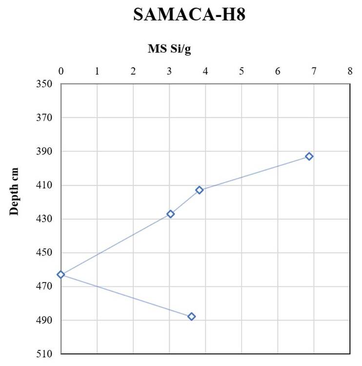 The magnetic susceptibility readings for these Samaca H-8 contexts are all relatively low (Table 3). These range from 6.86 to 3.61 Si/g, reflecting the low abundance of iron oxides (Figure 14). Sample 365 stands out as its magnetic behavior appears to be diamagnetic (s/n), although this may be noise due to the low values recorded. In contrast, sample 351, which corresponds to SU 8216, presents a relatively high value of magnetic susceptibility (see Table 3). This SU reflects that it is probably a surface with small in situ burning lenses, decomposed organic matter, low amounts of Ca (0.65%) and neutral pH values (7.1), in contrast to sample 365, which presents the highest pH value of 8.