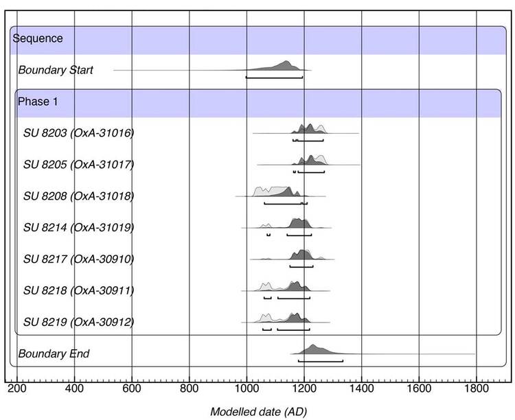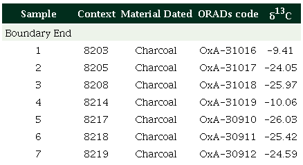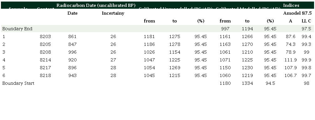 Seven contexts from Trench 3 were radiocarbon dated at Oxford University Radiocarbon Acceleration Unit (‘ORAU’), and then calibrated using ShCal20 (Hogg et al., 2020). The dates of these contexts show general correspondence with their stratigraphic sequence (see Table 2 and figure 9).