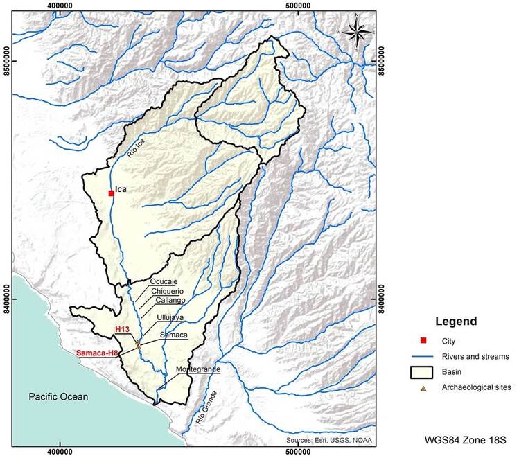 The Ica Valley of the south coast of Peru (Figure 1) has long been important to the development of Peruvian archeology. This region was the cornerstone from which a chronology for the entire Andean region was proposed first by Rowe, Menzel and colleagues (see Rowe, 1962; Menzel, 1971). Despite numerous critiques, revisions and updates, this periodization, better known as Rowe’s Ica Valley Master Sequence (Figure 2) (Rowe, 1960, 1962; Menzel, 1964, 1971, 1976), continues to be used by Andean researchers (e.g., Ramón, 1994, 2005, 2010, 2013; Del Águila, 2010; Tantaleán, 2016). Years of research here have revealed the long pre-Columbian history of the Ica Valley, opening up several lines of study. The valley is widely related to the development of the Nasca culture, of the Early Intermediate Period, which understandably calls the attention of specialists and the general public. This paper, however, centers on a less disseminated period of this region, the Late Intermediate Period -considered to be a span of time in which several Andean regions consolidated locally-based cultural expressions, from a site called Samaca H-8, which emerged by the end of the Middle Horizon and consolidated its development around AD 1000. Moreover, it examines this case study from a geoarchaeological perspective to explore how environmental aspects, alongside anthropogenic interventions, shaped the history of this ancient community.