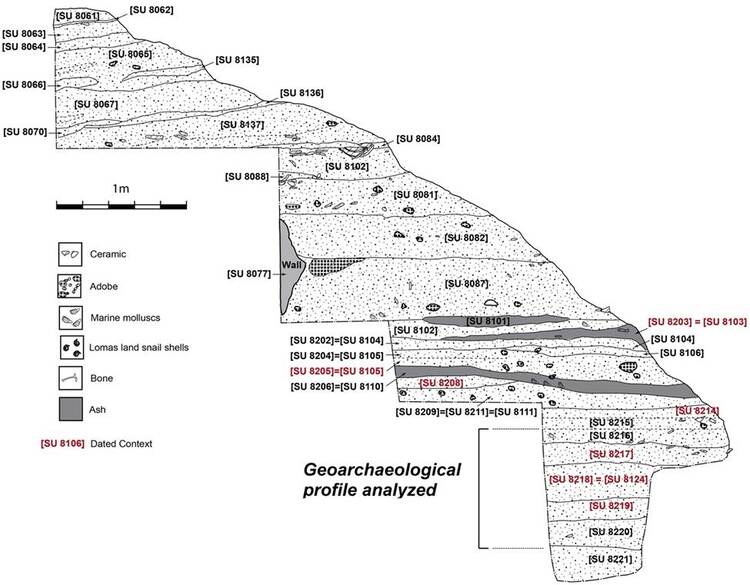 On top of units 8217 and 8216, there were c. 50 cm of alternating horizontal units of fine sand/silt with shell fragments interspersed with grey micritic ash and fine charcoal (i.e., SU 8206 and 8207). Covering this sediment was a thick conglomerate (c. 2 m thick) containing mud bricks, botanical remains, bones and much Late Intermediate Period pottery (Santana, 2021), together with the remains of collapsed adobe brick deposits.