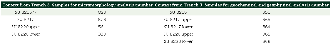 Micromorphology is the microscopic study of thin sections obtained from undisturbed soil and sediment samples collected in blocks and consolidated by impregnation in polyester resin (Courty et al., 1989). Our research was based on the observation and study of thin sections. The samples were extracted from the stratigraphic profile exposed by excavation of Trench 3, Samaca H-8 (Figure 9 and 10). Four blocks for micromorphological analysis (after Murphy, 1986; Courty et al., 1989) were taken (see Table 1) from three stratigraphic units (‘SU’s): from top to bottom SU 8216, SU 8217, SU 8220. They correspond to periods of initial occupation and pre-foundation (levels prior to occupation) of the site, respectively (see Figure 9). These were analyzed by Charles French at the Department of Archaeology, University of Cambridge.