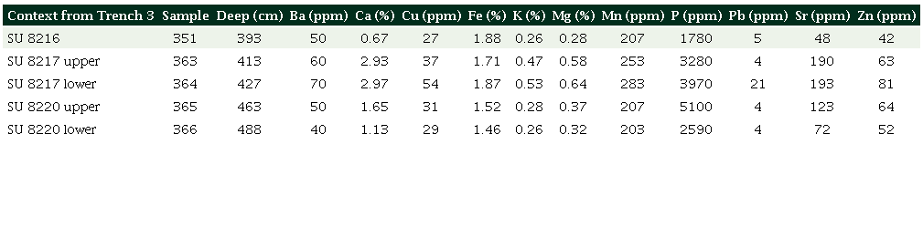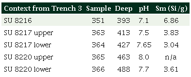 Magnetic susceptibility is a measure of the ability of a soil or sediment to become magnetized when placed in a magnetic field and is a rough measure of iron and other ferromagnetic components (Clark, 1996). Five samples taken from the stratigraphic units 8216, 8217, 8220 underwent the magnetic susceptibility analysis (see Table 1).
