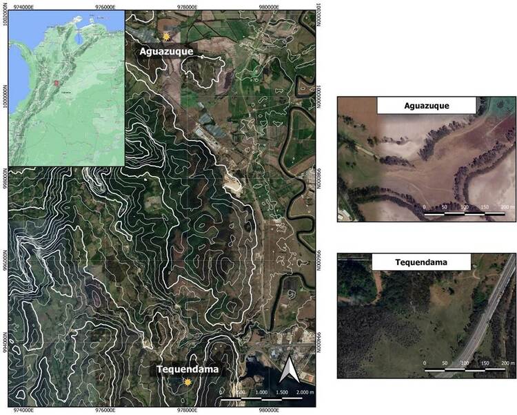 Aguazuque and Tequendama have temperatures between 12 ºC and 18 ºC; the average annual precipitation is 698 mm; altitude at the sites ranges between 2.000 and 3.000 m. above sea level. Yet, Tequendama has an altitude of 2.570 meters above sea level and it is characterized by having a dry montane forest, while Aguazuque altitude is 2.550 and a lowland wet rainforest predominates (Correal, 1990; Correal and Van der Hammen, 1977).