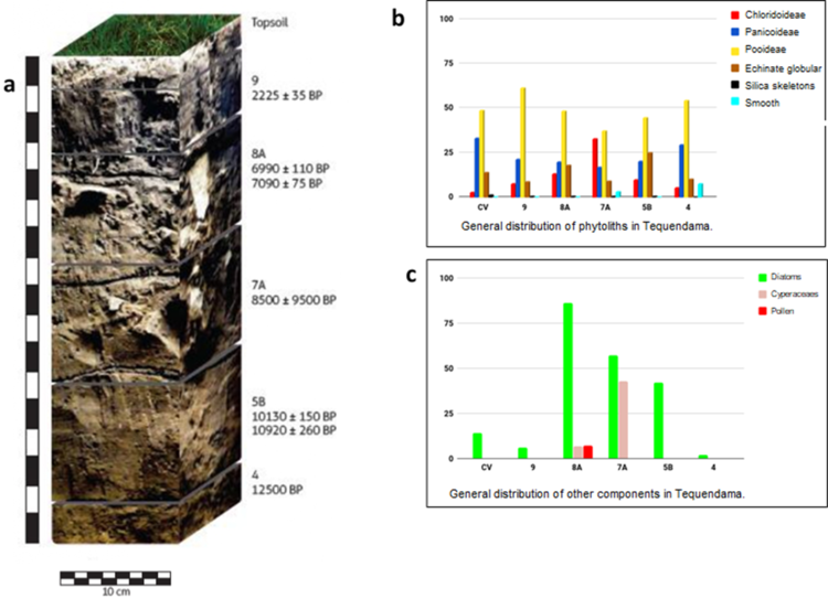 Data obtained from phytoliths in Tequendama during the transition between Pleistocene to early Holocene coincide with micro-morphological and physical-chemical analyses carried out by Triana (2019) in the same stratigraphic levels for this locality, which show humid environmental conditions in the end of Pleistocene and beginnings of Holocene. That can also be observed in carbon isotopic relationships in soil organic matter collected from level 5B in the site.