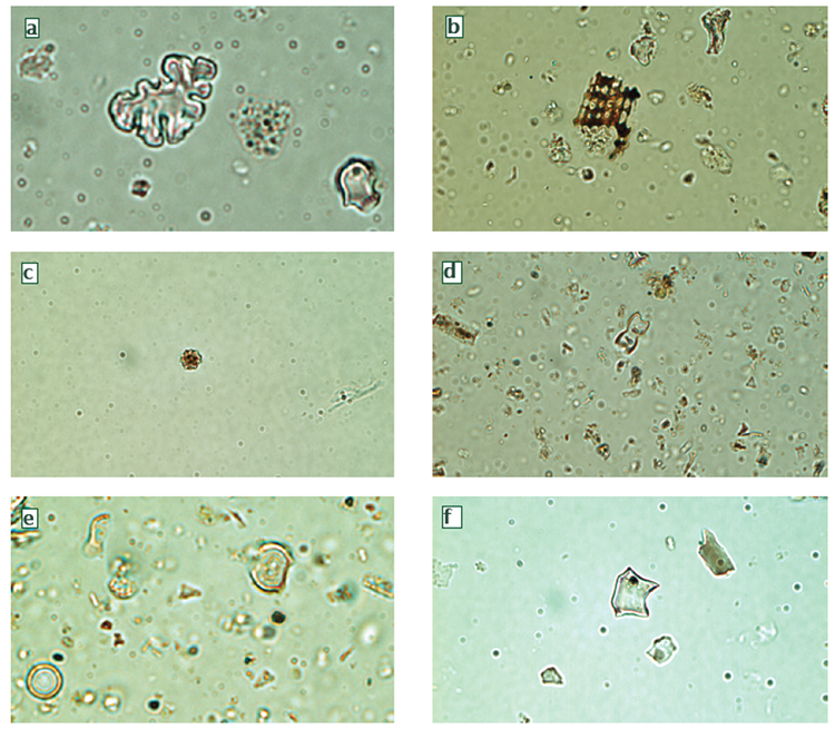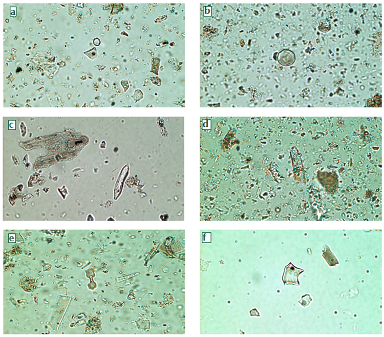 •Stratigraphic level 41 : there is hardly any evidence of organic matter, yet plenty of phytoliths and their fragments. Several silica skeletons can also be observed, which were also found in levels 52 and 42. Stomatocysts and diatoms decrease in this sample. Ciperaceae are still present. Some bullate phytoliths show corrosion and a Bambosoideae phytolith was identified (Figure 5f). Trichomes, elongated cells and echinate globular phytoliths have low frequencies.