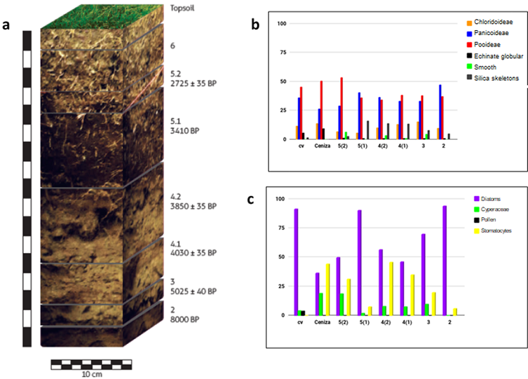 Diatoms, stomatocysts, and Ciperaceae phytoliths indicate humid and swamp-like conditions. Trichomes are mesophilic cells from where phytoliths detach and have the shape of hair or of the trichome base they separated from. Those components were counted despite not having been plotted due to the frequency they tend to appear. A brief description of the collected phytoliths will be provided next for each stratigraphic level (See Figures 2a, 2b and 2c to understand their distribution):