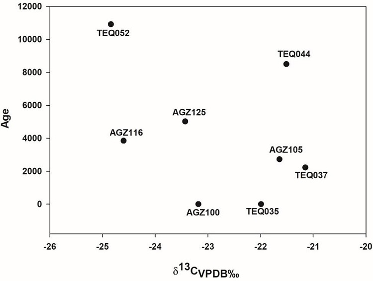 It can be observed in figure 7 that the most negative value -24.8‰ in soil organic matter comes from sample TEQ 052 in 10130, as compared to -21.5‰ in sample TEQ 044. Later, values go down to -23.4‰ in sample AGZ 125, and increase in sample AGZ 105, -21.6‰. Values in sample TEQ 037 increase to -21.5‰ as it is the case of samples TEQ 035 and AGZ 100, which correspond to current layers of organic matter in soil, as follows: -21.9‰ and -23.1‰.