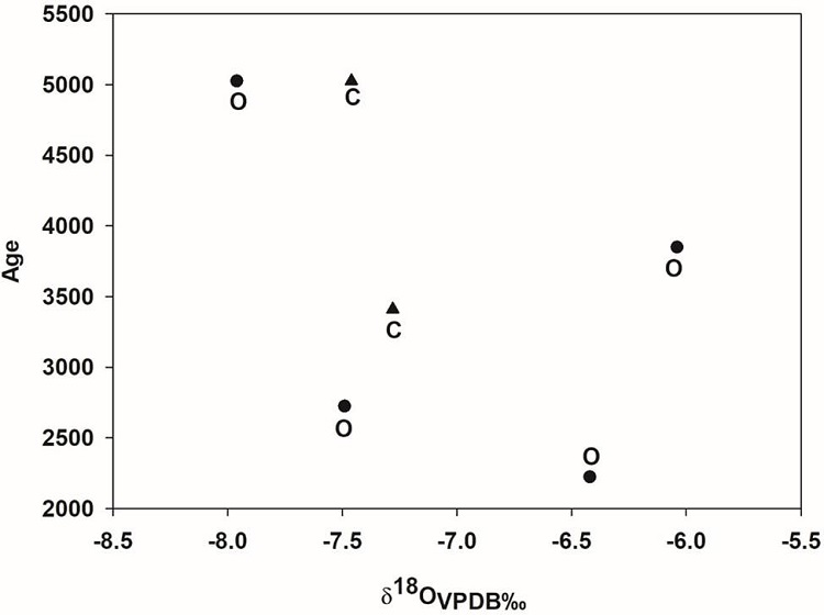 In the case of δ18O values, these were first converted to VSMOW using the formulas proposed by Faure (1977): δ18OVSMOW: 01.030901 * δ18OVPDB + 30.91, and then δ18O of water through the Iacumin et al. (1996) formula: δ18Owater = δ18OVSMOW - 33.63/0.998. Finally, the δ18Owater were converted to MAT (Mean Annual Temperature) using the formula of Rozanski et al. (1993): MAT(°C)=δ18OH2O(VSMOW) + 12.68 /0.36.