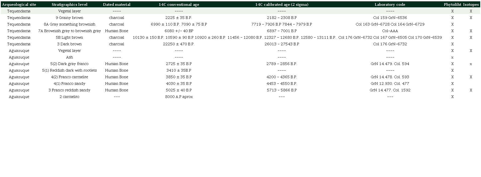 The results of phytolith analysis in the stratigraphic profiles of Tequendama and Aguazuque were obtained from the same profile used to carry out physical and chemical soil analyses.