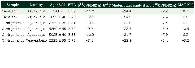 Three teeth of Odocoileus virginianus and two of Cavia sp were collected in 2014 in Aguazuque and Tequendama (see Table 2). To evaluate the degree of diagenesis, 10 mg were chosen, and each sample was ground and sieved (125 μm mesh size) to obtain a uniform fine powder. Later, these samples were analyzed by Fourier-transform infrared spectroscopy with attenuated total reflectance sampling (FT-IR-ATR) at Laboratorio de Geoquímica Ambiental Molecular, Instituto de Geología-UNAM, Laboratorio Nacional de Geoquímica y Mineralogía-Instituto de Geología (LANGEM). The FT-IR-ATR values of dental enamel were compared with the values of crystallinity index proposed by Weiner (2010) and Asscher et al. (2011), 2.5 to 4.6, to evaluate the presence of diagenesis.