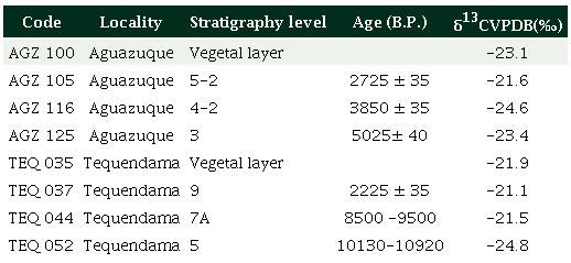 During the span of time ranging from 4.000 to 3.000 B.P., a high presence of phytoliths and components related to humid conditions was seen. That is the case of Ciperaceae belonging to swamp environments, and diatoms and stomatocysts associated to bodies of water that are absent in Tequendama. Considering that humidity is one of the factors that contribute to the presence of C3 plants, the conditions in this locality at that time favored the development of this type of plant, which can be seen in carbon isotopic analysis of levels 4 to 2 in Aguazuque (Medrano and Flexas, 2001).