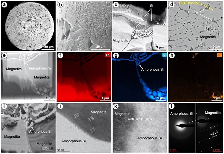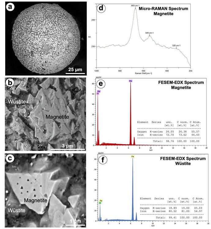 The largest iron-rich oxide spherule (~75-175 µm) was found in the Yakovitsa chromitite (Figure 2a-2l). It consists of an interlocking polygonal structure made up of micro-crystallites of magnetite with junctions, which are filled by a finely-grained symplectite of magnetite and amporphous Si glass with trace amounts of P (Figure 2a-2l). Single-spot analyses obtained by EMPA show relatively homogenous composition of magnetite across the whole sphere with up to 93.47 wt.% FeOt, minor Mn (0.54-0.61 wt%), CoO (0.14-0.17 wt%), Cr2O3 (0.03-0.16 wt%), Al2O3(0.03-0.05 wt%), NiO (0.01-0.06 wt%), SiO2 (<0.5 wt%), and no TiO2, MgO or CaO (Table 1). The smaller iron-rich oxide spherule identified in Golyamo Kamenyane (Figures 3a-3c) consists of dendritic magnetite (Fe2O3) microcrystals within a wüstite (FeO) groundmass as determined by micro-RAMAN and FESEM-EDX analysis collected from the spherule surface (Figures 3d-3f). The discrete crystals of magnetite are small (<5 µm) faceted-equant grains with cubic arrangement perpendicular to (111) crystal faces (Figure 3b), whereas rosaries of sub-micrometric spherules of magnetite occur widespread in the wüstite groundmass (Figure 3c).