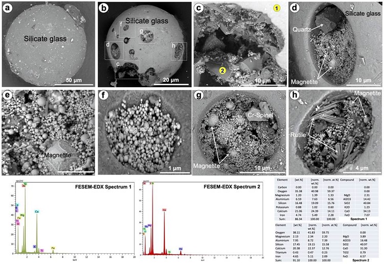 The glassy spherules are both colorless with a smooth surface (Figures 4a and 4b) relatively homogenous in composition dominated by SiO2 (~41 wt.%), CaO (31-34 wt-%) and Al2O3 (14-15 wt%), and lesser amounts of FeOt (~7 wt.%), MgO (2-4 wt.%) as well as Ti and K < 1.5 wt.% (see EDX inset in Figure 4). These two spherules were partly smashed during the mounting process, reveling internal continuity of the vitreous structure with the typical conchoidal fractures of glassy materials (Figures 4c and 4d). The spherule recovered from the Golyamo Kamenyane chromitite displays shrinkage features such as bubble-like vesicles now filled with a suite of secondary minerals including magnetite, quartz, rutile or mixtures of them (Figure 4b). Under high magnification magnetite exhibit rounded to octahedral-habit, whereas quartz is prismatic and rutile is needle-like to acicular crystals grown perpendicular to the surface of the vesicle.