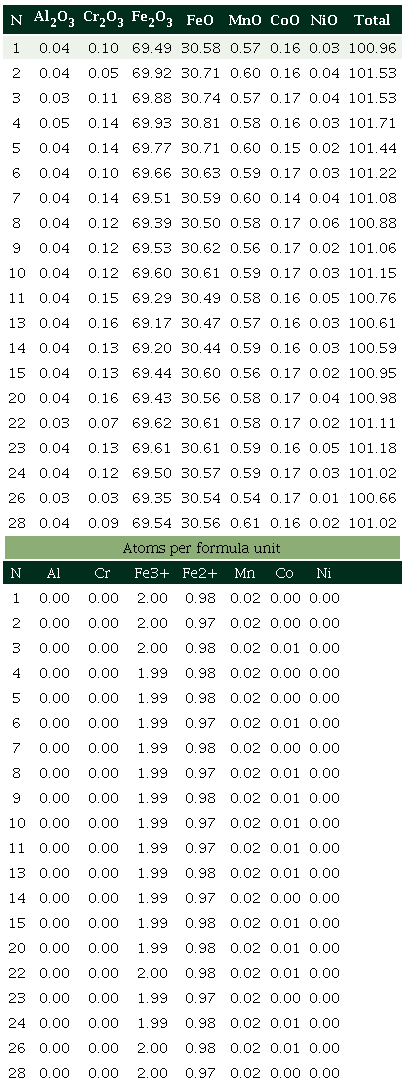 EPMA data were obtained using an excitation voltage of 20 kVand a beamcurrent of 20 nA, with a beam 2-3 μm in diameter. Monitored spectral lines were MgKα, FeKa, AlKα, CrKα, SiKα, TiKα, MnKα, NiKα, CoKα, ZnKα and VKα. Standards used were MgO, Fe2O3, Al2O3, Cr2O3, SiO2, CoO, ZnO, TiO2, MnTiO3, NiO and Pb5(VO4)3Cl.