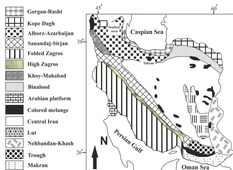 Iranian Plateau is a tectonically active region within the Alpine-Himalayan orogenic belt and stands at a compressional zone between two rigid convergent blocks (Arabia and Eurasia) (Berberian and King, 1981). In the classification of the structural units of Iran (Nabavi, 1976), this area is situated in the western Alborz-Azarbaijan zone (Figure 1), which is part of the Alpine-Himalayan fold belt. During the Devonian, Alborz-Azarbaijan Range was part of the northern edge of the Gondwana, which was moving toward the north due to convergence with Laurasia in the north (Berberian and King, 1981).