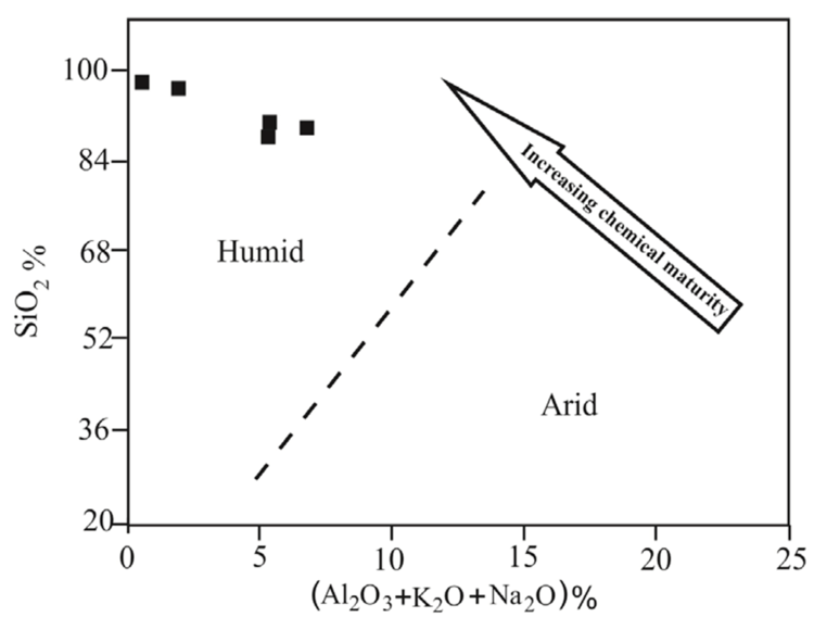 In order to determine the degree of weathering of sediments, different indices have been suggested based on the molecular ratios of various oxides of different elements, especially mobile ones (MgO, CaO, K2O, and Na2O), relative to immobile elements and oxides, such as ZrO2, Al2O3, and TiO2 (Parker 1970; Nesbitt and Young, 1982; Fedo et al., 1995; Nesbitt et al., 1996; Scheffler et al., 2006). One of the most important criteria for determining the intensity of chemical weathering is the chemical index of alteration (CIA) (Nesbitt and Young, 1982). The CIA is expressed as Al2O3/ (Al2O3 + CaO*+ Na2O + K2O) x 100, where all the oxides are in molecular proportion and CaO* represents Ca in silicate minerals. (Nesbitt and Young, 1982). The studied sandstone and shale samples had CIA values of 78.18 to 90.42 and 91.55 to 91.93, respectively (Table 3). The climatic condition of the source areas of siliciclastic sediments can also be determined based on the diagram of SiO2 versus (Al2O3+K2O+Na2O) (Suttner and Dutta, 1986) (Figure 10), in which samples of the Ilanqareh Formation were plotted in the humid climate range.