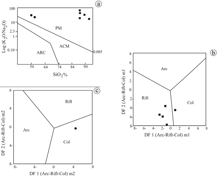 In K2O/Na2O versus SiO2 diagram proposed by Roser and Korsch (1986), the data from studied samples fell into a passive margin tectonic setting (Figure 11a). By using the new major element discrimination function diagrams of Verma and Armstrong-Altrin (2013) all the studied sandstones (except sample IS14 with (SiO2)Adj >95 %) and one shale sample (ISH6) were completely in the rift field of the high-silica diagram, and one shale sample (ISH3) fell into the collision range using the low-silica diagram (Figures 11b and 11c).