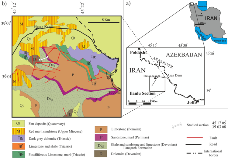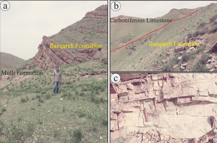 The present study has investigated an outcrop around the city of Jolfa and south of the Aras Dam (Northern Ilanlu village) called the Ilanlu section (Figure 2). The thickness of the Ilanqareh Formation in the Ilanlu section is 520 meters (Figure 3), and it is located over the dolomites of Mulli Formation, and the upper boundary contains Carboniferous limestones (Figures 4a and 4b).