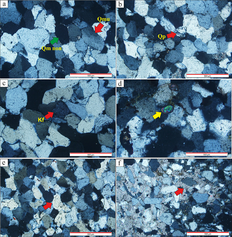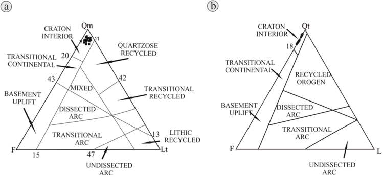 In terms of grain size, the studied sandstones were mostly fine to medium, and they were moderately to well-sorted. The petrographic composition of the Ilanqareh sandstones is listed in Table 1. The main components of these sandstones were quartz and potassium feldspar. In all samples, quartz occurred with nonundulatory monocrystalline quartz being the dominant type and ranging from 29.3% to 45.5% (avg. 40.4%) in the Ilanlu section (Figure 5a). Undulatory extinction monocrystalline quartz (Figure 5a) ranged between 11.7% and 30.8% (avg. 23.0%). The polycrystalline (Figure 5b) quartz variety was a common form with an average of 1.9%. Feldspar occurred as K-feldspar (Figure 5c) ranging from 1.7% to 4.4% (avg. 2.8%). There were no lithic fragments in the Ilanqareh sandstones. Accessory minerals (avg. 3.2%) occurred in the form of muscovite and some heavy minerals, such as tourmaline and zircon (Figure 5d). Cements occurred in the most abundant forms of carbonate ranging from 0% to 38 % (avg. 15.5%), iron oxide ranging from 0% to 13 % (avg. 8.8%), silica ranging from 1% to 9 % (avg. 5.2%), and clay ranging from 0 % to 9 % (avg. 4%), respectively (Figures 5e and 5f). In order to classify the sandstones, their counted components were recalculated to 100%, excluding cements, matrix, and accessory components. Based on the average composition of the three main framework grain (Table 1), the composition of the sandstones was found to be quartzarenite and subarkose according to the Folk (1980) classification (Figure 6a) and quartzose based on the Garzanti (2016) classification (Figure 6b). Plotting the point-counting data of the Ilanqareh Formation on the diagram of ratio of total quartz on total feldspar plus rock fragments (Qt/F+RF) against polycrystalline quartz and chert on feldspar plus rock fragments (Suttner and Dutta,1986) indicated the existence of a humid climate (Figure 7). Based on recalculated compositions of the sandstone’s modal analysis (Qm-F-Lt and Qt-F-L; table 2), all the studied samples fell into the craton interior field (Figures 8a - 8b).