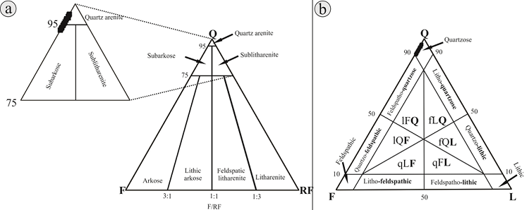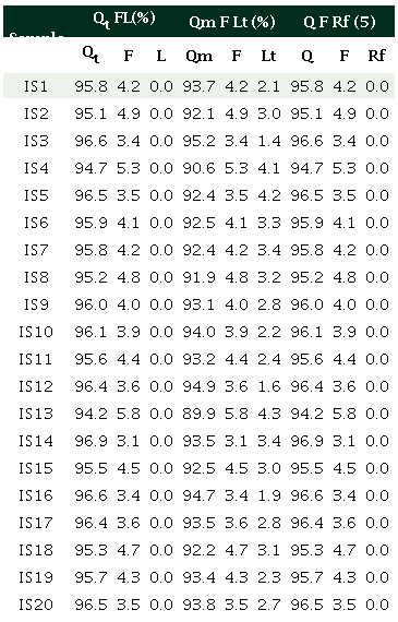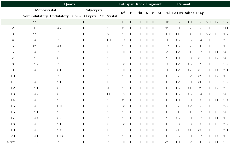 A stratigraphic outcrop from the Ilanqareh Formation was measured and sampled at the Ilanlu section. Thirty representative fresh samples were selected for petrographic investigations. Among them, twenty medium-grained sandstone samples were selected for modal analysis. The amounts of detrital and diagenetic components were determined by counting 300 points in every 20 thin sections (Table 1). Point counting was done using the Gazzi-Dickinson method (Ingersoll et al., 1984). Table 2 lists the recalculated modal compositions for the sandstones. Total abundances of the major oxides were reported on a 0.5g sample analyzed by ICP-emission spectrometry following a lithium metaborate/ tetraborate fusion and dilute nitric digestion at the laboratories of the ACME, Canada (Table 3). Weight difference after ignition at 1000°C used to determine Loss on ignition (LOI). For each element analyzed, the reproducibility of replicate analyses and the deviation from the certified values of the secondary standards are less than 5% relative.