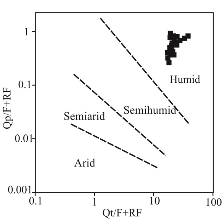 The intensity of chemical weathering is a function of the climate and tectonic activity. Lower tectonic activity and higher humidity in the source region result in more intense chemical weathering. The use of point-count data and whole rock geochemical data can help in assessing the paleo-climate condition of siliciclastic sediments (Suttner and Dutta, 1986). The ratio of Qt/F+RF against Qp/F+RF (Figure 7), also the high amount of SiO2 in contrast to the low amount of Al2O3, K2O and Na2O (Figure 10) in studied sandstones indicated that the degree of chemical weathering in the source areas of these sediments was moderate to high, which is confirmed by the values of the chemical index of alteration calculated for the studied sandstone and shale samples (Table3). The paleogeographic maps presented by Bagheri and Stampfli (2008) also show that the region of Azarbaijan was located above 30 degrees south latitudes during the early Devonian to the early and middle Permian and according to Zhuravlev and Sokiran (2020), this region was located in a temperate climate during the Late Devonian.