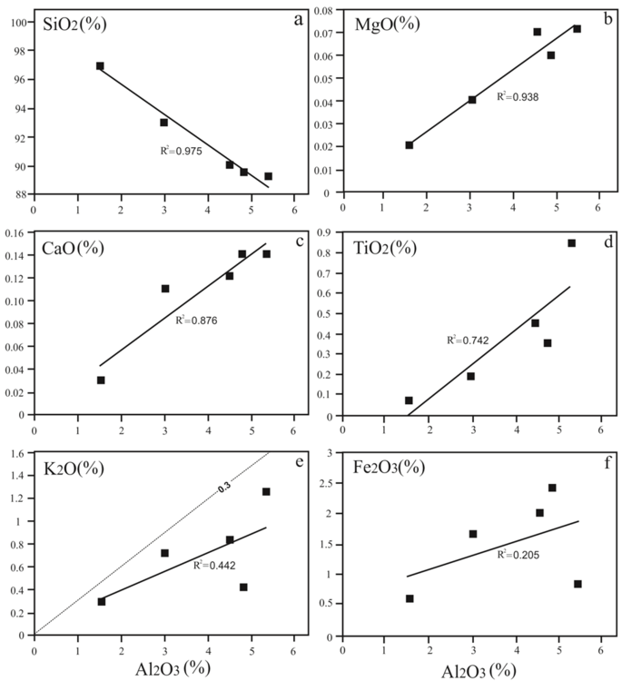 Table 3 presents the major element concentrations of the analyzed sandstone (N=5) and shale (N=2) samples. The SiO2 content of the sandstone samples ranged from 89.24% to 97.04% (avg. 91.78 wt%), while shale samples had SiO2 content of 53.78 wt% to 56.22 wt%. The sandstones were also characterized by low content of Al2O3 (1.53-5.37 wt%), CaO (0.05-0.14 wt%), TiO2 (0.07-0.85 wt%), Fe2O3 (0.57-2.42 wt%), and K2O (0.3-1.25 wt%). These major oxides also had very low values in the shale samples except for the Al2O3, which varied from 25.59 wt% to 27.78 wt%. The major oxides of sandstones were examined based on bivariate diagrams against Al2O3. Accordingly, Al2O3 and SiO2 showed a negative correlation (Figure 9a). Among the other oxides, MgO, CaO, and TiO2 showed strong positive correlations with Al2O3 (Figures 9b-9d). On the K2O against Al2O3 (Figure 9e), all samples lay below the K2O/Al2O3 ratio of 0.3 (dotted line), which indicated that most of the K2O were inside the clay fractions (K2O/Al2O3 < 0.3) and not in the potassium feldspars (0.3 < K2O/Al2O3 < 0.9, according to Cox et al. (1995)). Among the other oxides, Fe2O3 showed a weak positive correlation with Al2O3 (Figure 9f), and the remaining major oxides (MnO and Na2O, not illustrated in Figure 9) indicated a low correlation with Al2O3.