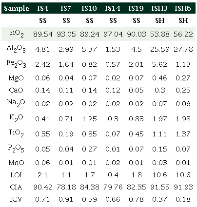 The Index of Compositional Variability (ICV; Cox et al., 1995) expressed as ICV = (Fe2O3 + K2O + Na2O + CaO +MgO + MnO + TiO2)/Al2O3 can be used to measure the degree of the recycling and compositional maturity of siliciclastic sedimentary rocks. As can be seen in Table 3, the sandstones and shales of the Ilanqareh Formation had ICVs of 0.59-0.91 and 0.18-0.37, respectively.