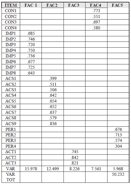 Para validar la confiabilidad del instrumento de recolección de datos se estimó el alfa de Cronbach. El análisis y captura de datos se realizó con el software SPSS, utilizando estadística descriptiva, inferencial y análisis factorial. También, se hizo uso de la prueba de Kruskal-Wallis para encontrar diferencias entre grupos. La consistencia interna de la escala total de medición estimada con el Alfa de Cronbach fue de .819 resumida a 33 ítems. Los resultados del análisis factorial exploratorio mediante componentes principales, con rotación varimax, muestran que el análisis es aceptable; lo que permitió la extracción de 5 factores que contribuyen a medir la Cultura de sustentabilidad y medio ambiente. Estos factores fueron nombrados conocimiento, importancia, acciones sustentables, percepción y actitud. En la Tabla 1 se ilustra la matriz de componentes rotada en la cual aparecen los ítems con mayor peso de cada factor y la varianza total explicada.