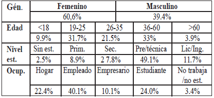 Los estadísticos de la unidad muestral de los individuos que participaron en la investigación se presentan en la Tabla 2. En general, fueron mayormente mujeres, de edades de entre 19 a 60 años, con estudios de preparatoria o carrera técnica; que son empleadas, estudiantes o se dedican al hogar.