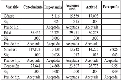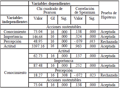 Con referencia a la asociación entre los factores que forman parte de la Cultura de sustentabilidad y medio ambiente, los resultados prueban, los supuestos planteados, ya que todos los factores encontrados presentan una asociación significativa para el conocimiento, importancia, actitudes y percepción sobre el desarrollo de acciones sustentables, aunque en el caso de la percepción fue negativa. De igual manera, se encontró un vínculo del conocimiento con estos mismos factores. El estadístico también fue significativo y positivo para todos ellos, con excepción de la percepción (Tabla 3).