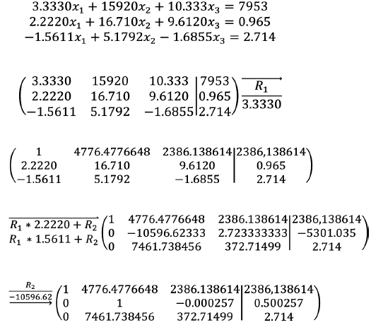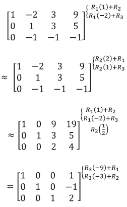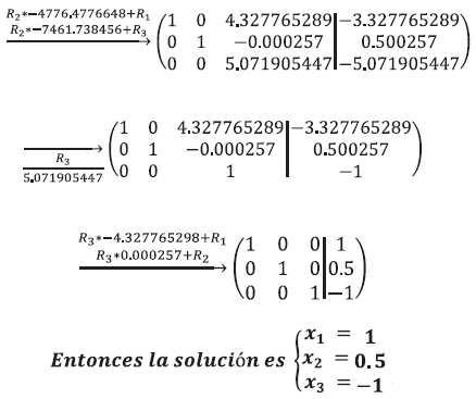Ahora se resuelve el mismo sistema de tres por tres con Gauss-Jordan quedando la solución como sigue: