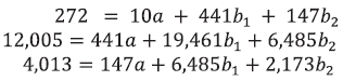 Utilizando la información de la tabla, se generan tres ecuaciones las cuales son las siguientes: