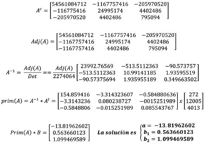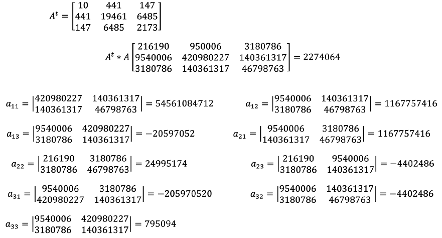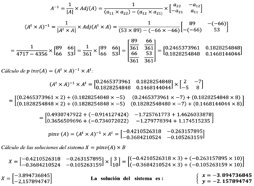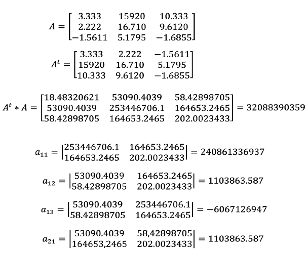 Cálculo de (At * A)-1 (como es una matriz de 2 X 2 la inversa se calculará con el método de la adjunta).