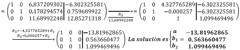 El siguiente paso es resolver este sistema de ecuaciones para encontrar los coeficientes de la recta de predicción de regresión. Aquí se aplica el Método de Mínimos Cuadrados, quedando el proceso como se muestra: