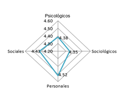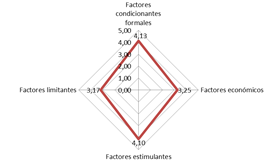 La figura 3 muestra de forma integral las dimensiones de la creación de empresas, resaltando que los empresarios tiene mayormente desarrollados los factores condicionantes formales (4.13 puntos) donde se hace referencia a la realización de trámites y programas de apoyo y fondos públicos, seguido de los factores estimulantes (4.10 puntos) donde se encuentran todos los factores que motivan al emprendedor a crear su empresa, tales como crear algo propio, conseguir un patrimonio e independencia económica entre otras. Y entre los factores con área de oportunidad se encuentran los factores económicos (3.25 puntos) que hace referencia a las fuentes de financiamiento para por realizar el proceso de creación de empresas como son ayudas oficiales y programas de apoyo y finalmente los factores limitantes con 3.17 puntos, donde sobresale la situación económica, falta de capital y temor a fracasar entre otros.