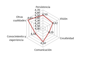 La figura 2 da evidencia de las características presentes en el perfil emprendedor y resaltan cualidades como el buen juicio, don de mando, apreciar el valor de responsabilidad (4.65); con el mismo puntaje se encuentran la persistencia y la comunicación (4.50) y aquella que requiere mayor atención es la creatividad (4.26).