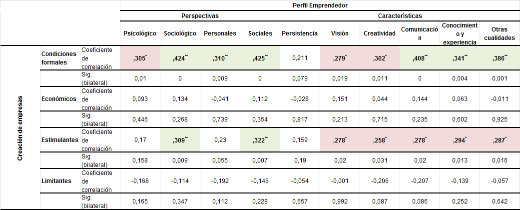 Características del perfil emprendedor en sus dimensiones: visión (0.279*) y creatividad (0.302*).