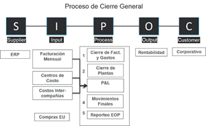 Define: se identificó el VOC (voz del cliente) como un requerimiento directo del corporativo en Estados Unidos y los CTQ´s del proyecto: Identificar la totalidad de las operaciones implicadas en la meta, generar una validación por contabilidad y por operaciones de la veracidad de la información generada y una digitalización de los procesos como medida Poka Yoke y garantizar la estabilidad de dichos procesos. Se definió la Carta del proyecto: a). Caso de negocio: Se requiere una solución que permita hacer más eficiente el proceso de cierre mensual. Deberá considerar los subprocesos que intervienen y forman parte del proceso general de cierre mensual, así como de las diferentes áreas funcionales y los principales actores que intervienen en estos procesos. b). Enunciado del problema: El proceso de cierre mensual se ha excedido del tiempo límite establecido (más de un día) por el corporativo por los últimos 8 meses, además de que no se conoce exactamente cuáles son la variables que lo impactan, complicando su revisión y por ende, su mejora como proceso. c). Meta: Reducir el tiempo total del proceso de cierre para entregar en el 100% de los casos a más tardar en un día. d). Defecto: Cada cierre mensual que exceda de un día para su presentación a corporativo. e). Oportunidades de defecto: uno por mes. El diagrama de procesos se muestra en la figura 1.