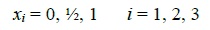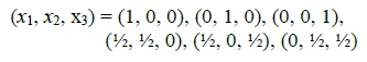 (4)Los tres vértices (1, 0, 0), (0, 1, 0) y (0, 0, 1), son las mezclas puras, mientras que los puntos (½, ½, 0), (½, 0, ½) y (0, ½, ½), son mezclas binarias o mezclas de dos componentes localizados en los puntos medios de los tres lados del triángulo; existen también diseños simplex reticulares (3,3), (4,2) y (4,3); en general, el número de puntos en un diseño simplex reticular {p,m} es [13]: