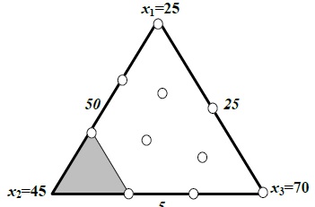 (2)Para dos componentes, el espacio de los factores del diseño incluye todos los valores de los dos componentes que están sobre el segmento de recta x1+x2=1, con cada componente siendo acotado por 0 y 1; con tres componentes, el espacio de la mezcla es un triángulo con vértices que corresponden a las mezclas puras (100% de un solo componente) [13].