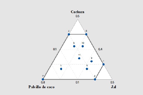 Debido a que el proceso que se analiza no requiere demasiada precisión, se optó por un diseño simplex de grado 1 aumentado con puntos axiales y central sin réplicas para ajustar un modelo lineal; mediante el software Minitab se obtuvo este diseño el cual se muestra en la figura 2, donde observa que consiste de 11 puntos de prueba con un área de experimentación restringida que no incluye las áreas cercanas a los vértices cachaza o composta y jal, así como el orden aleatorio para cada prueba.